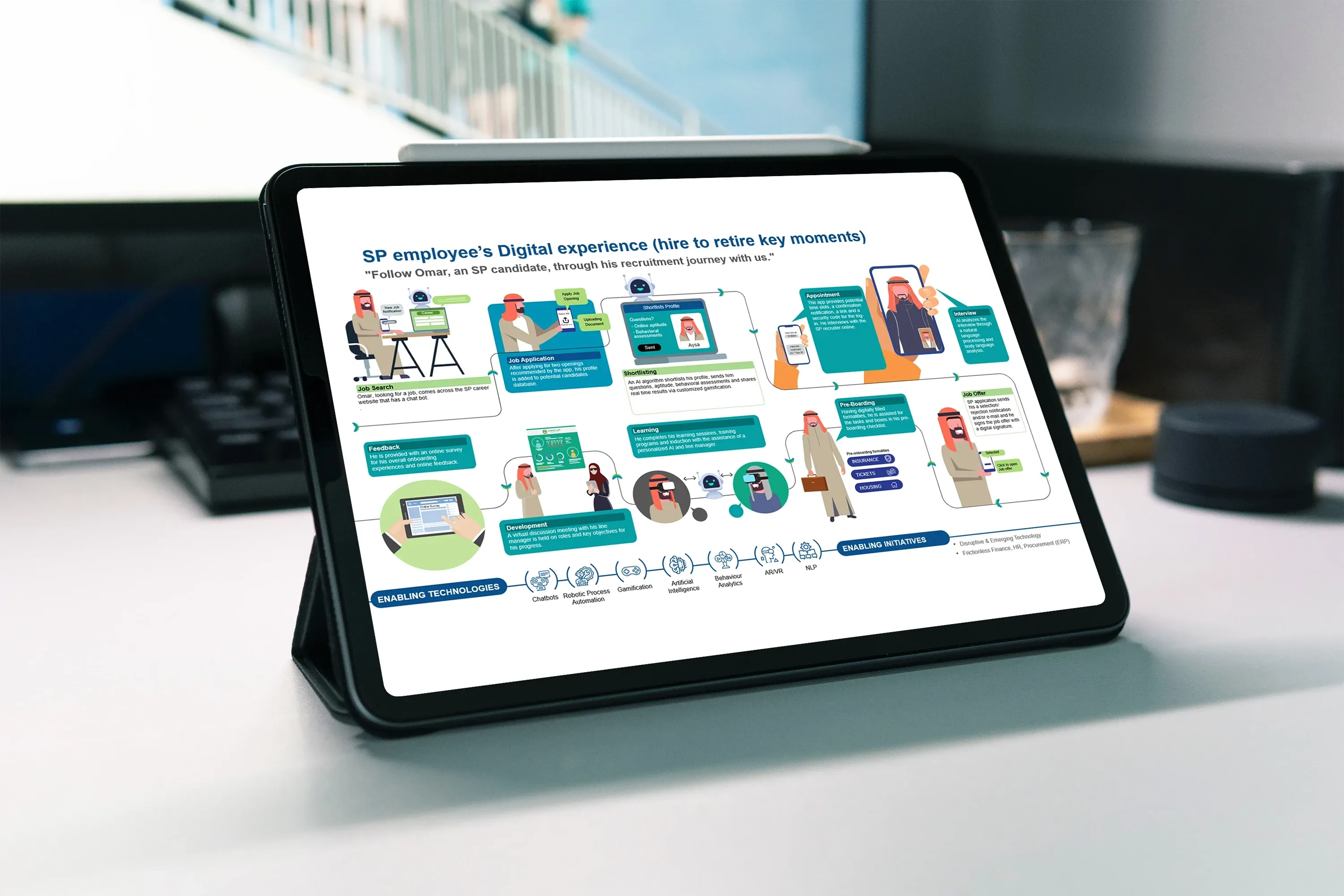 Develop a series of illustrations that depict various user journeys, highlighting how artificial intelligence (AI) simplifies and enhances employees' daily tasks and overall work experience. The employees and stakeholders within the client's organization in the Middle East, aiming to foster understanding and engagement with AI-driven tools and processes.