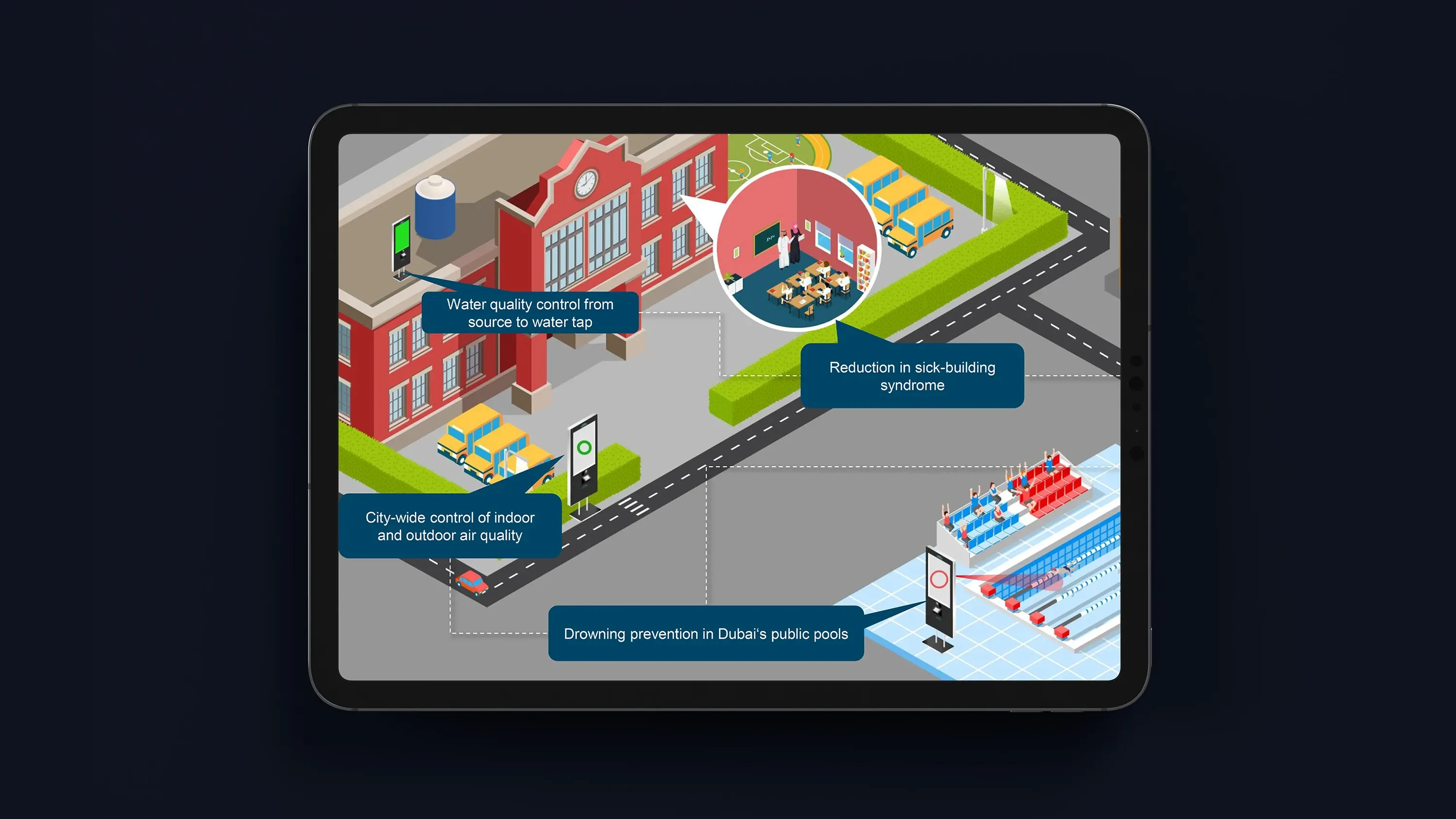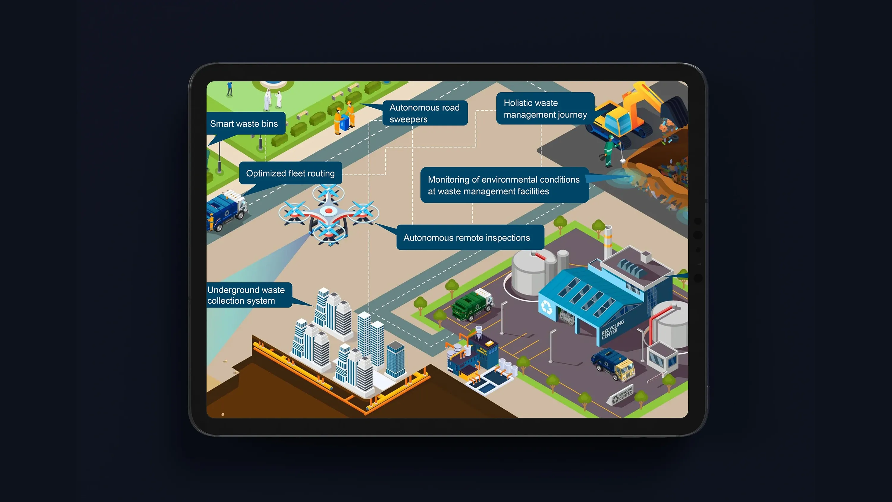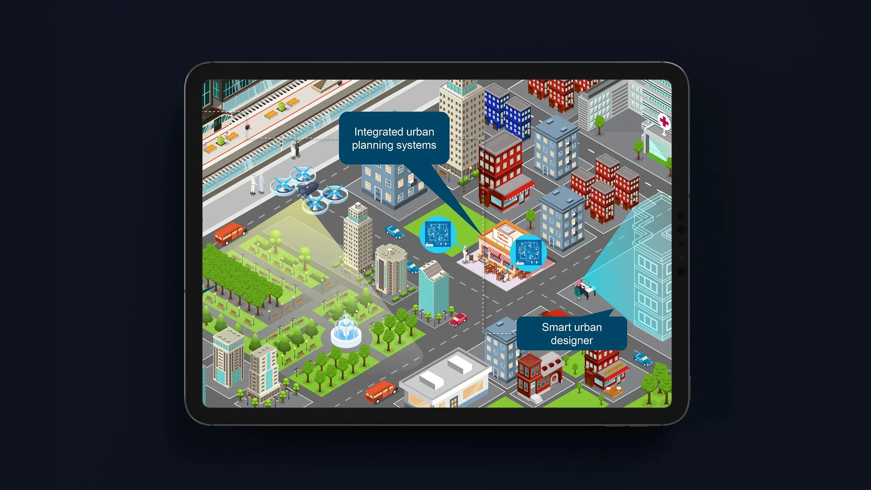Unlike lengthy written documents, isometric visuals offer an intuitive way to absorb information quickly. Users can instantly grasp how technology transforms various sectors, from healthcare to public safety, without needing extensive explanations.