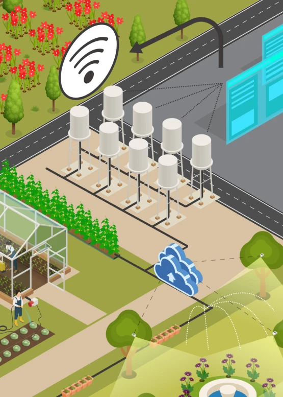Elements such as surveillance cameras, automated farms, and smart city sensors were placed strategically within the illustration to ensure coherence and logical placement.