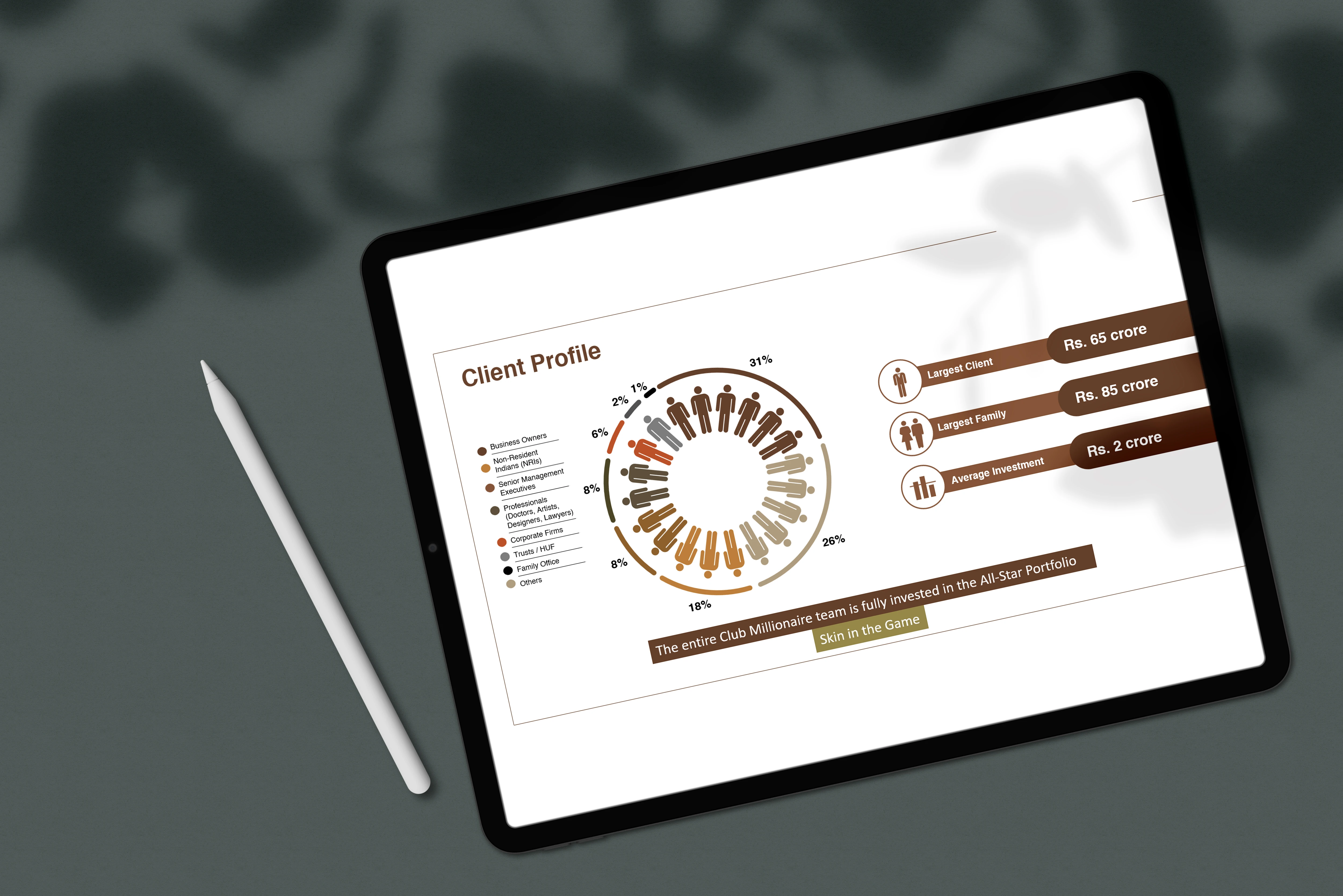 Club Millionaire’s Financial Portfolio Presentation seamlessly blends data visualization and custom illustrations to effectively communicate financial strategies. PalPixel transforms complex data into visually engaging and easy-to-understand content, ensuring the financial journey is presented with clarity and impact. Each slide is thoughtfully tailored to the client’s unique narrative, highlighting key aspects such as profitability metrics, client profiles, and product evolution with precision and creativity.